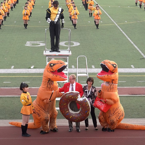 前夜祭のロビンソンスタジアムでのフィールドドリルでは、MCのアメリカ人男性から「みなさんを太平洋の向こうへお連れします!」という最初の挨拶が洒落ていた。さらにSing Sing Singのダンスと演奏は圧巻でありそれを観れば、Orange Devilsといわれる所以が誰もが納得するだろうというようなことを言っている。この生徒の中に義足の女の子がいて、MCの男性は前に出て来るように観客全員に彼女を紹介する。この年のパレードにスターが多いのだが、金丸仁美さん(ニックネームはクララ)というフルート奏者に世界中の人々や多くの障害者を勇気づけたことであろう。生まれつき、左脚の膝から下がなく義足で参加しているにも関わらず、泣き言を言わず他の生徒達と同じメニューで厳しい練習に耐え抜いてきたからだ。彼女が1年生の時、吹奏楽部に入部した頃、成長期と相まって義足と膝の接合部が擦れて激痛が走ったそうだ。夏休みに骨を削る手術をして、義足を作り直しリハビリをこなし、休み明けには練習に復帰したという。